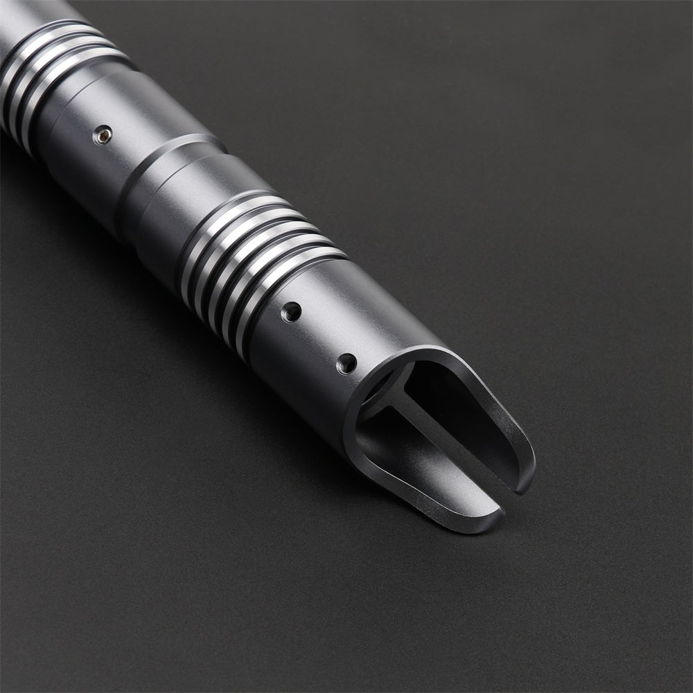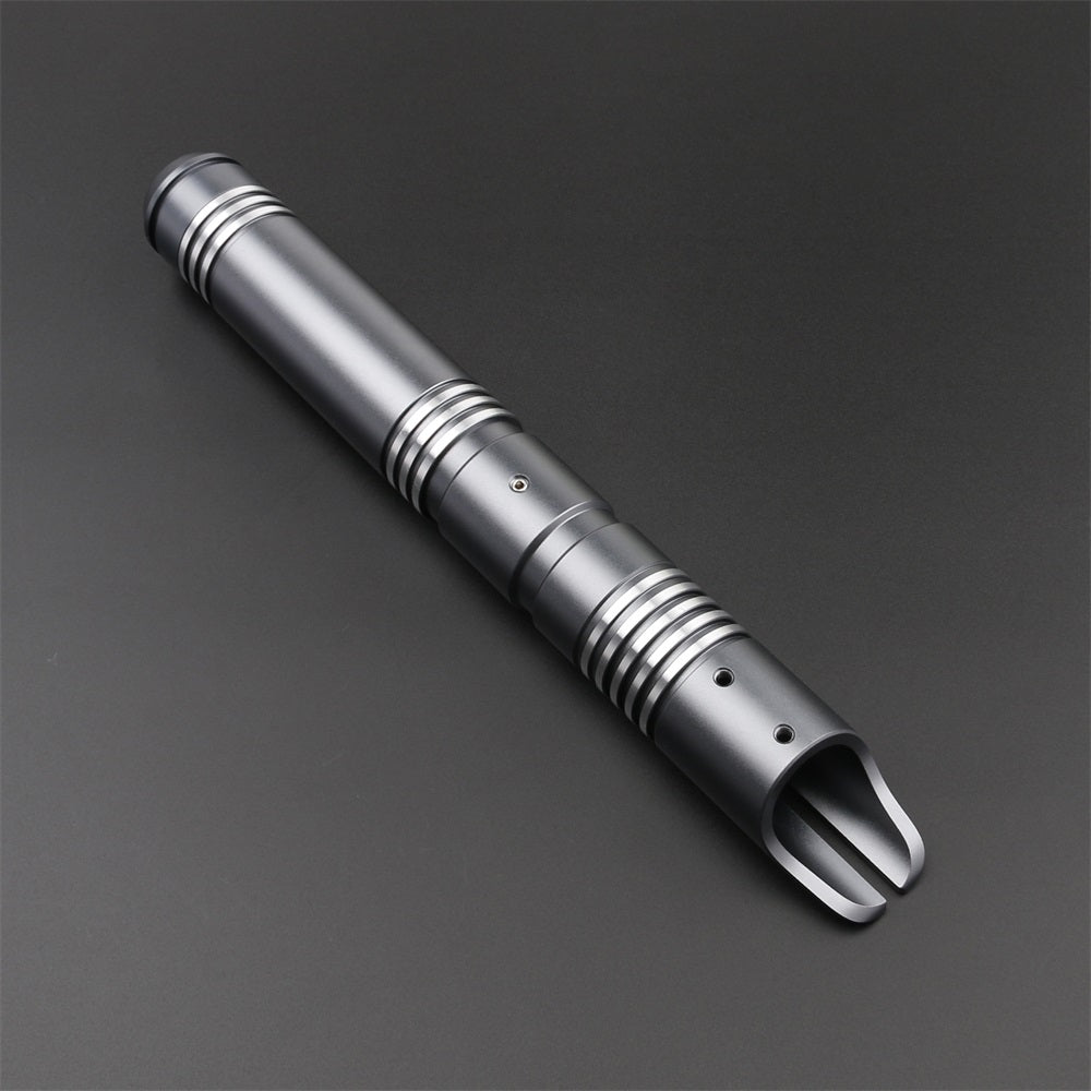Het handvat van dit lichtzwaard is gemaakt van een mat donker grijs kleurig aluminium legering met zilveren details. Dit zorgt ervoor dat het handvat licht van gewicht is en toch erg sterk is. Tevens heeft het handvat een gladde grip waardoor het fijn in de hand ligt. De uitsparing aan de bovenkant van het handvat zorgt voor een extra lichteffect en is een kleine knipoog naar "The Mandalorian".
