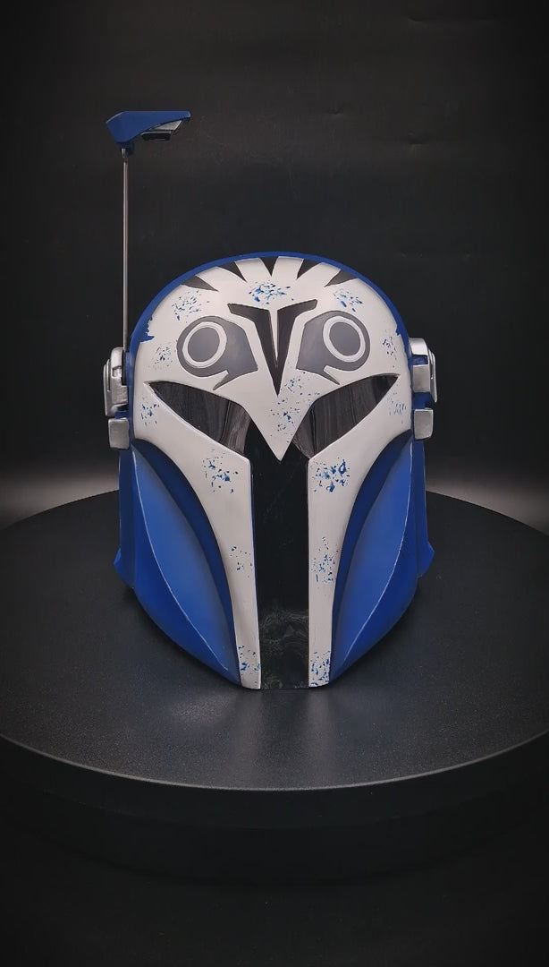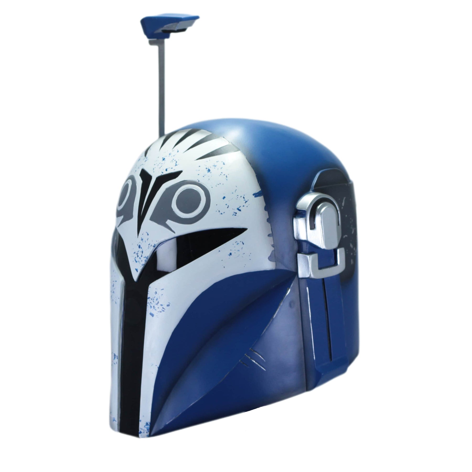 Het ontwerp bevat alle klassieke elementen van een Mandalorian helm, met de iconische T-vormige vizier en een strakke, gestroomlijnde afwerking. De blauwe en witte kleuren met subtiele details benadrukken Bo-Katan’s status als een vechtster van de Mandalorianen.