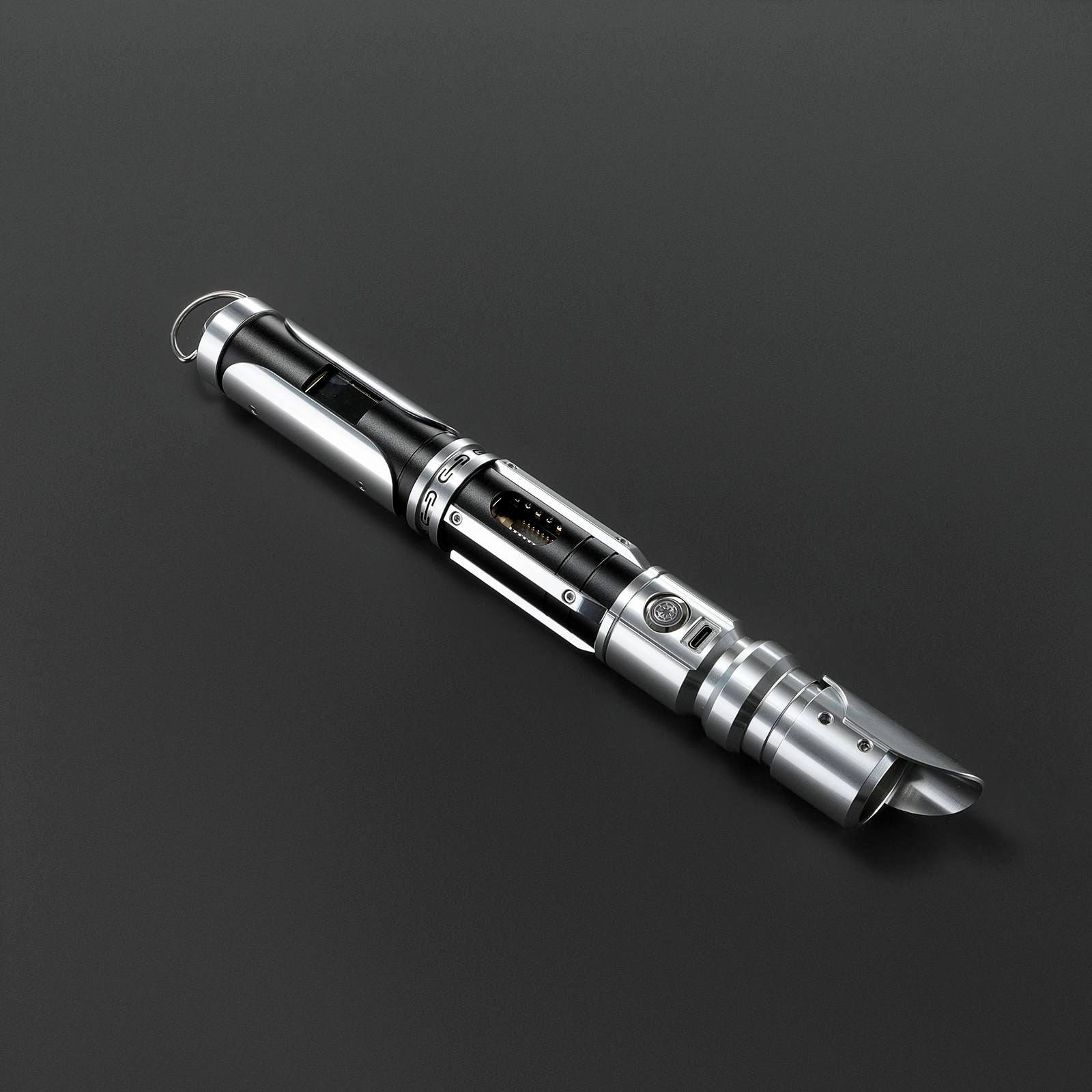 Onderaan de hilt bevinden zich twee zilverkleurige zijplaten en een front-facing LCD-scherm dat bij elk soundfont automatisch de bijbehorende afbeelding toont. De onderkant (pommel) van deze saber is voorzien van D-Clip. Deze zorgt ervoor dat je de saber aan je riem kan hangen. Hiervoor heb je wel de KenJo Sabers Riemclip nodig. Elk detail is ontworpen voor maximale impact, zowel tijdens gebruik als op display.