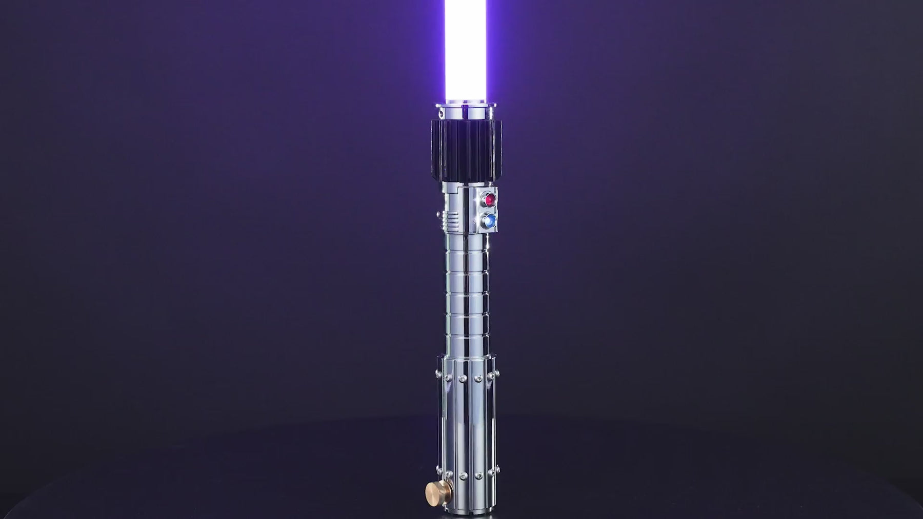 Jade’s Heir is een zeer unieke saber met een volledig chromen afwerking en prachtig uitgewerkte details. De bovenkant van de saber is robuust en breder dan de middensectie, en voorzien van T-grips die voor een karakteristiek silhouet zorgen. De bedieningsknop is subtiel geïntegreerd aan de bovenzijde van het bredere emitterdeel. Direct daaronder vind je twee verlichte elementen in rood en blauw, die de saber een high-end uitstraling geven.
