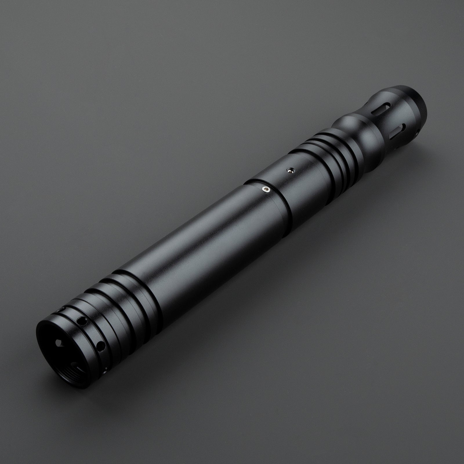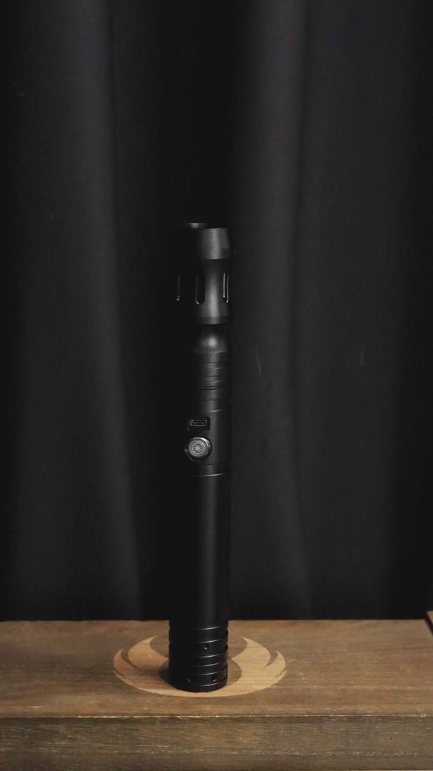 Beschrijving: Dark Eminent is een mat zwarte saber gemaakt van aluminium legering. Dit zorgt ervoor dat het handvat licht van gewicht is en toch erg sterk is. De saber heeft een versmalde emitter welke prettig vasthoudt maar ook is voorzien van langwerpige uitsneden voor een extra lichteffect. Door de saber op deze plek vast te houden heb je een perfect balans. De zwaardligging is goed diep in het handvat waardoor deze super stevig vast zit. Bij elkaar maken deze zaken de Dark Eminent uitermate geschikt om mee te duelleren of te spinnen. Het handvat zelf is geheel zwart en glad wat zowel prettig vasthoudt als de saber een strakke uitstraling geeft. Aan de onderzijde van de saber bevind zich een connector ring op de plaats van de pommel. Met een tweede saber zoals bijvoorbeeld de Acolyte hoef je dus niet een extra connector ring te kopen om een saberstaff te maken. De vlakke onderzijde zorgt er tevens voor dat de saber perfect stevig recht op gezet kan worden om te worden tentoongesteld in huis.