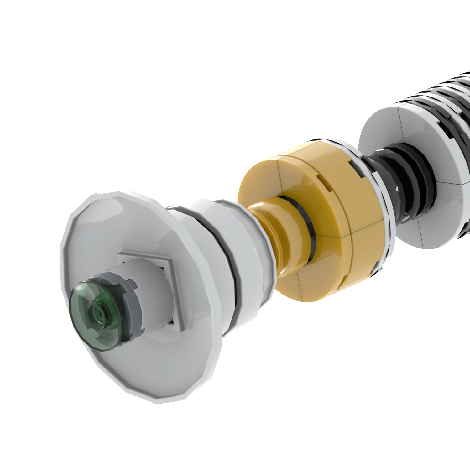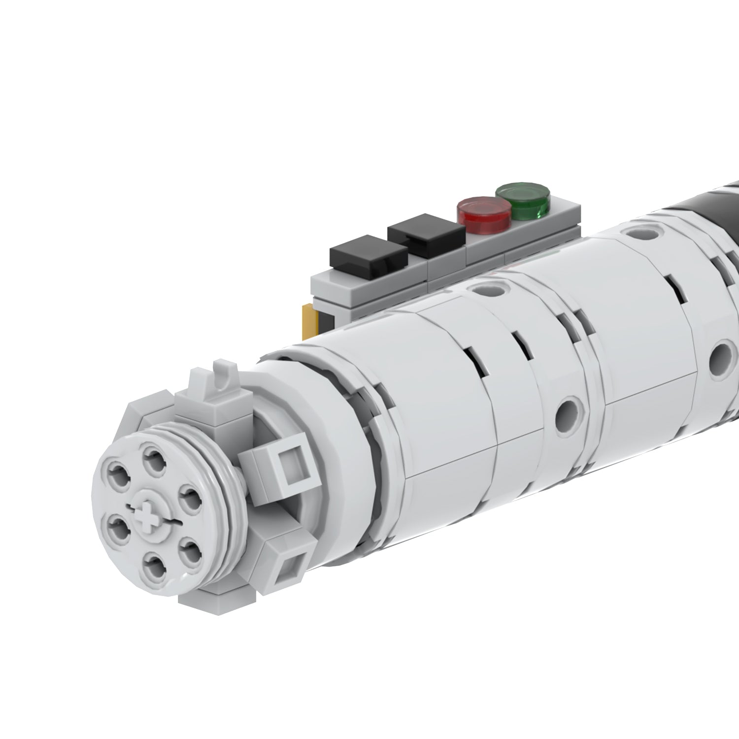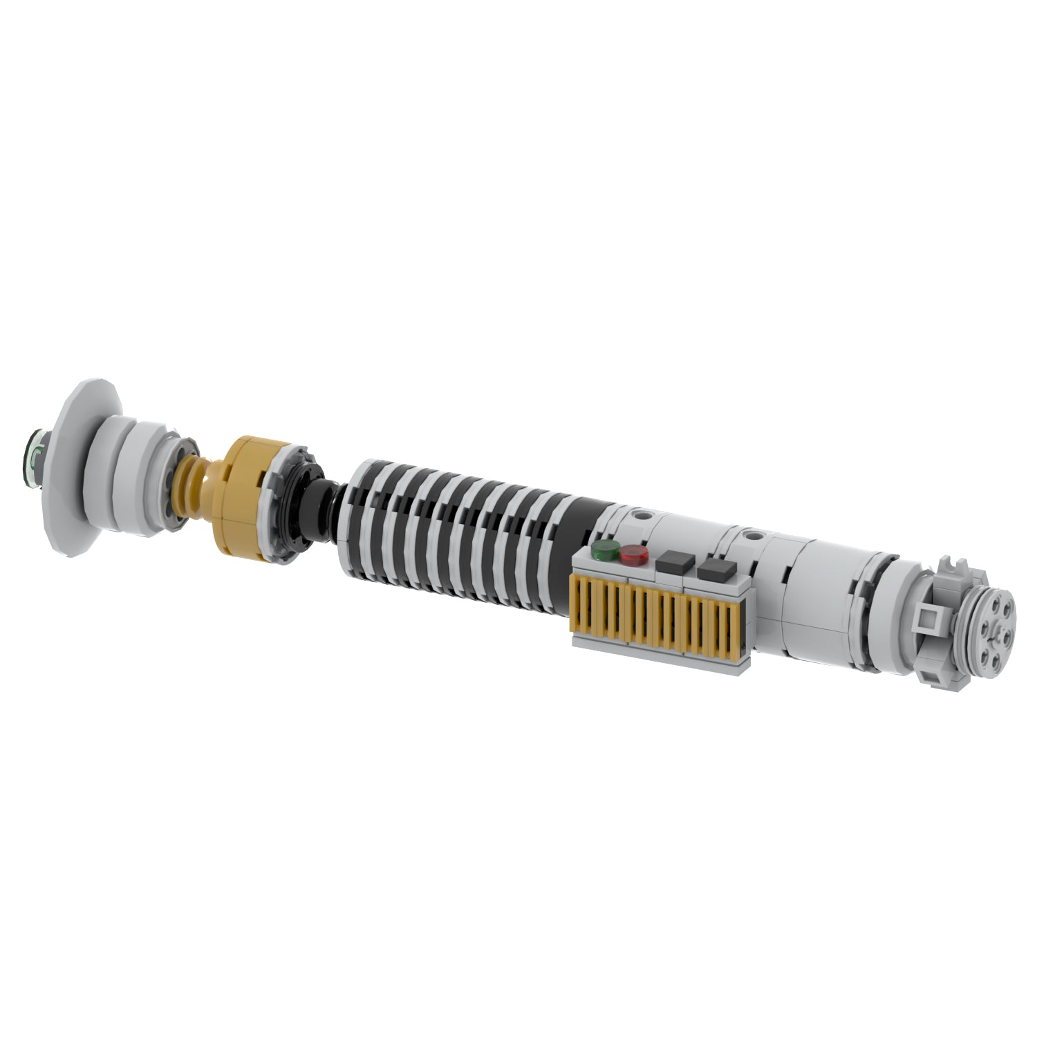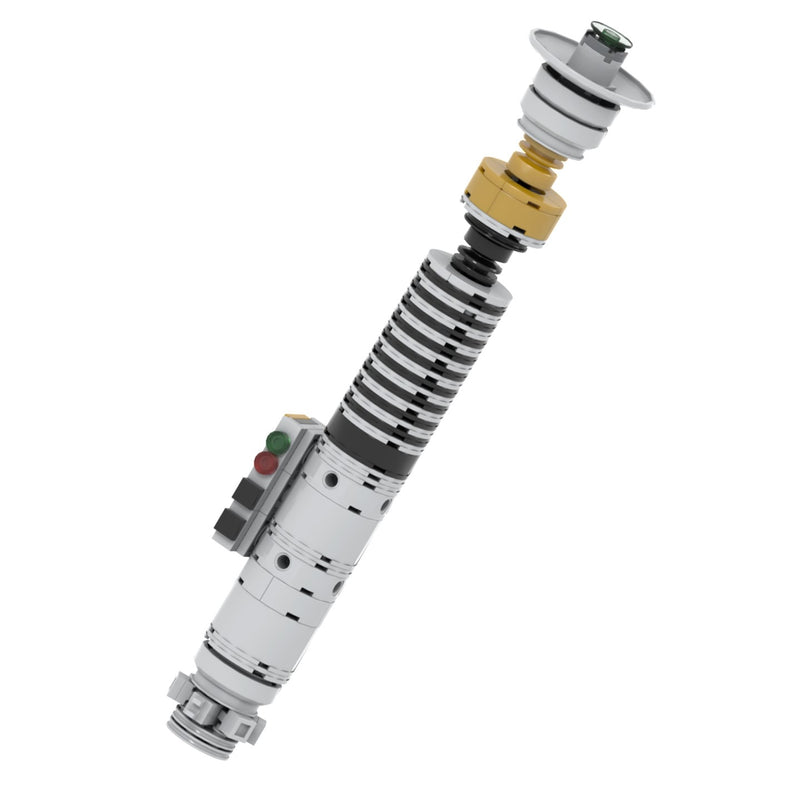 The Icon Super Bricks is een unieke, opvallende saber, in de basis grijs/zilver met kenmerkende zwarte accenten. De grip is voorzien van opvallende zwarte geribbelde beplating, terwijl de smalle nek een onmiddellijk herkenbaar element is dat de grootsheid van deze lightsaber benadrukt. De opstaande switch ofwel bedieningspaneel steekt herkenbaar uit.
