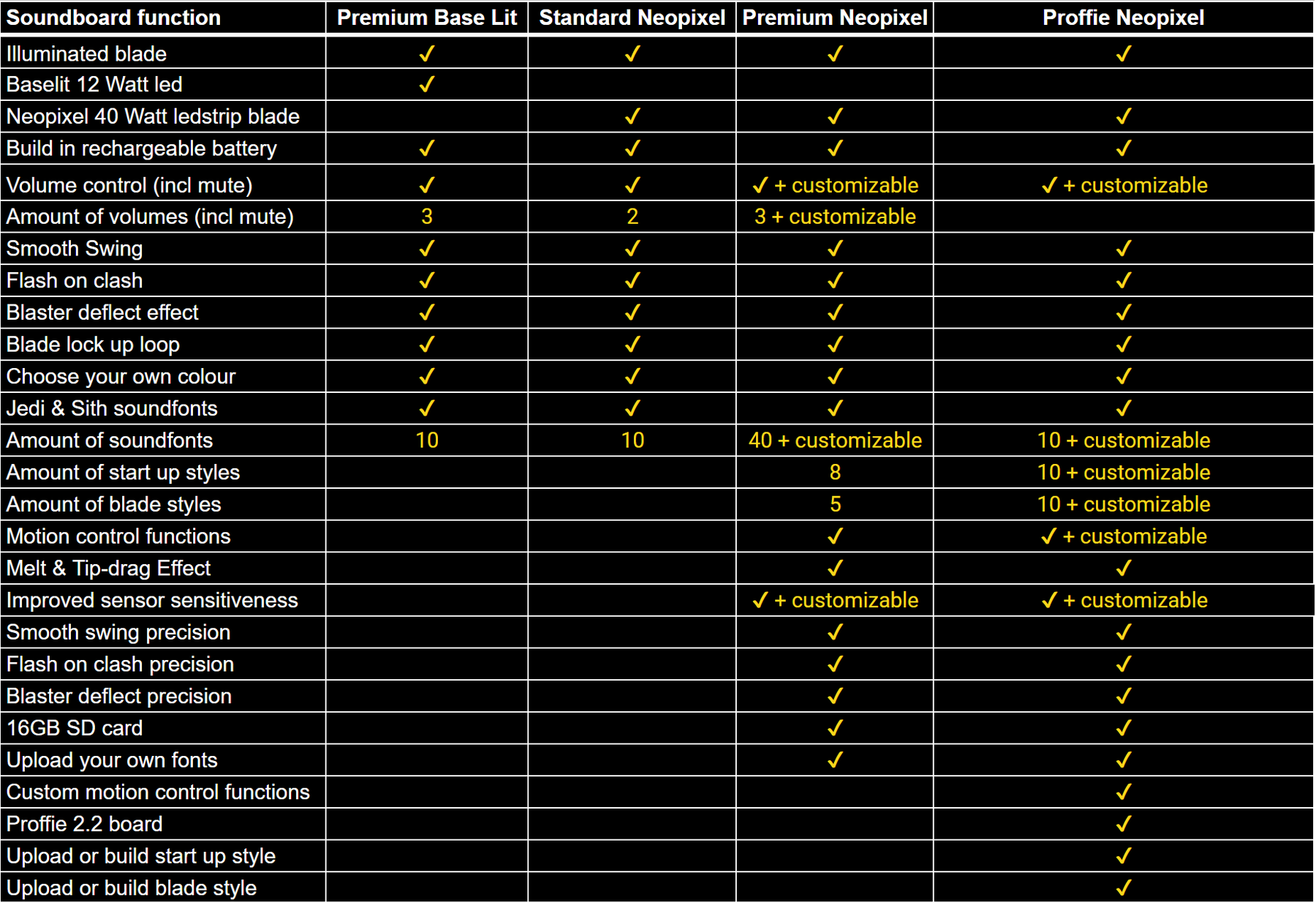 Elk soundboard biedt de mogelijkheid om uit verschillende kleuren te kiezen en is voorzien van verschillende geluidstypes. Een baselit saber is voorzien van een hol zwaard en een krachtige 12watt lamp, in een neopixel zwaard zit een super heldere 40 watt led strip welke het mogelijk maakt om verschillende blade styles en start up styles te laten zien. Afhankelijk van het soundboard dat je kiest gebeurd dit door middel van pre sets of zijn deze zelf te kiezen uit een aantal opties of zelfs volledig te customizen. Bij sommige KenJo Sabers soundboards is er zelfs een handige bluetooth app om de lightsaber mee te bedienen.
