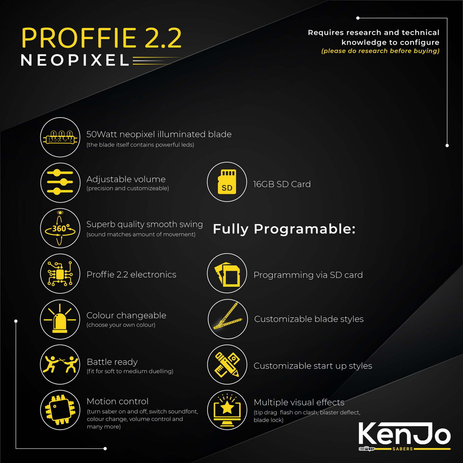 Elk soundboard biedt de mogelijkheid om uit verschillende kleuren te kiezen en is voorzien van verschillende geluidstypes. Een baselit saber is voorzien van een hol zwaard en een krachtige 12watt lamp, in een neopixel zwaard zit een super heldere 40 watt led strip welke het mogelijk maakt om verschillende blade styles en start up styles te laten zien. Afhankelijk van het soundboard dat je kiest gebeurd dit door middel van pre sets of zijn deze zelf te kiezen uit een aantal opties of zelfs volledig te customizen. Bij sommige KenJo Sabers soundboards is er zelfs een handige bluetooth app om de lightsaber mee te bedienen.