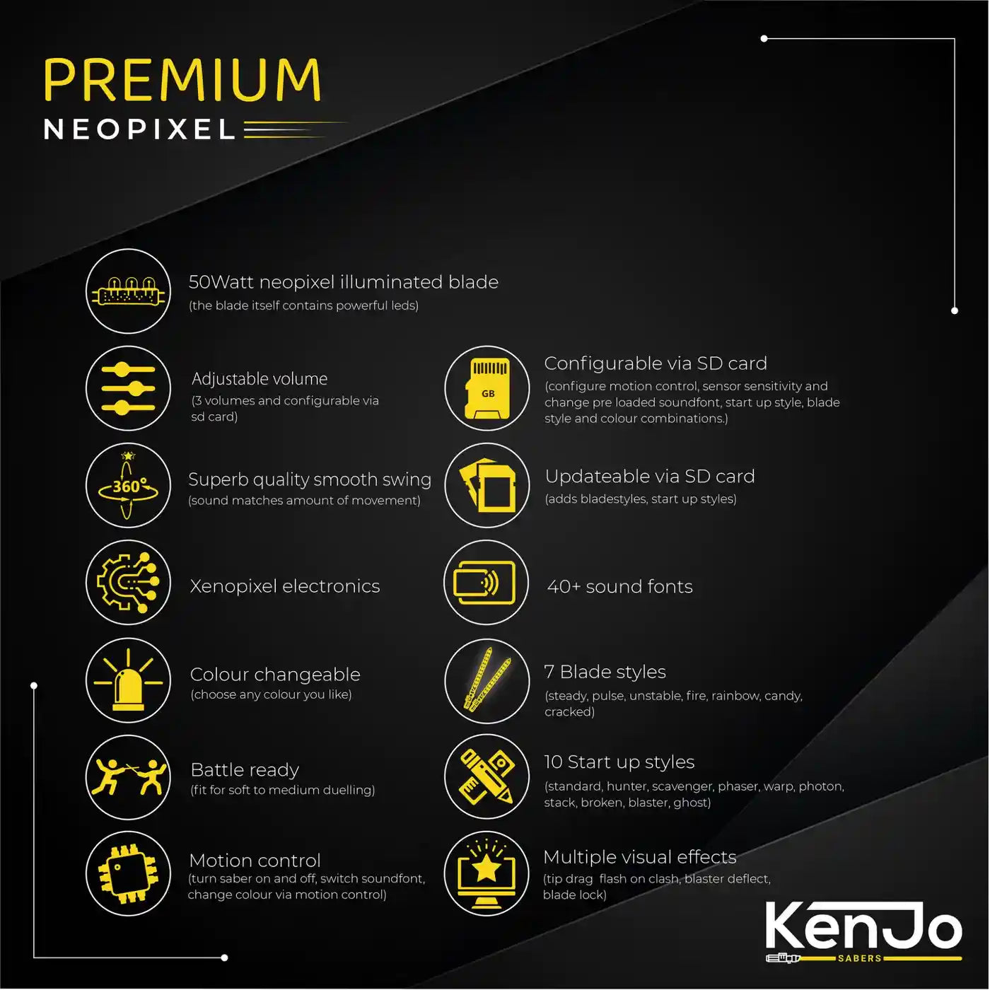 Elk soundboard biedt de mogelijkheid om uit verschillende kleuren te kiezen en is voorzien van verschillende geluidstypes. Een baselit saber is voorzien van een hol zwaard en een krachtige 12watt lamp, in een neopixel zwaard zit een super heldere 40 watt led strip welke het mogelijk maakt om verschillende blade styles en start up styles te laten zien. Afhankelijk van het soundboard dat je kiest gebeurd dit door middel van pre sets of zijn deze zelf te kiezen uit een aantal opties of zelfs volledig te customizen. Bij sommige KenJo Sabers soundboards is er zelfs een handige bluetooth app om de lightsaber mee te bedienen.