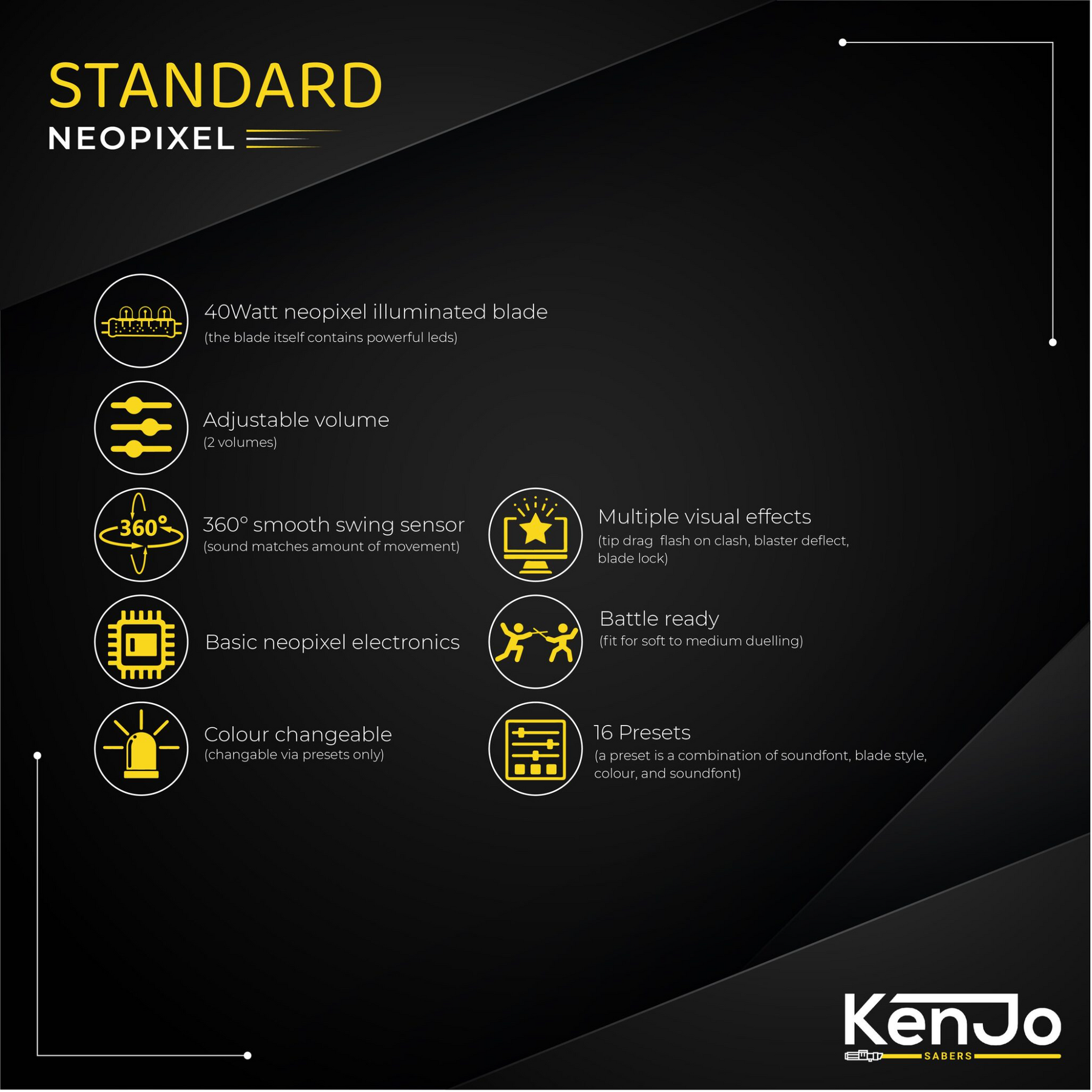 Elk soundboard biedt de mogelijkheid om uit verschillende kleuren te kiezen en is voorzien van verschillende geluidstypes. Een baselit saber is voorzien van een hol zwaard en een krachtige 12watt lamp, in een neopixel zwaard zit een super heldere 40 watt led strip welke het mogelijk maakt om verschillende blade styles en start up styles te laten zien. Afhankelijk van het soundboard dat je kiest gebeurd dit door middel van pre sets of zijn deze zelf te kiezen uit een aantal opties of zelfs volledig te customizen. Bij sommige KenJo Sabers soundboards is er zelfs een handige bluetooth app om de lightsaber mee te bedienen.