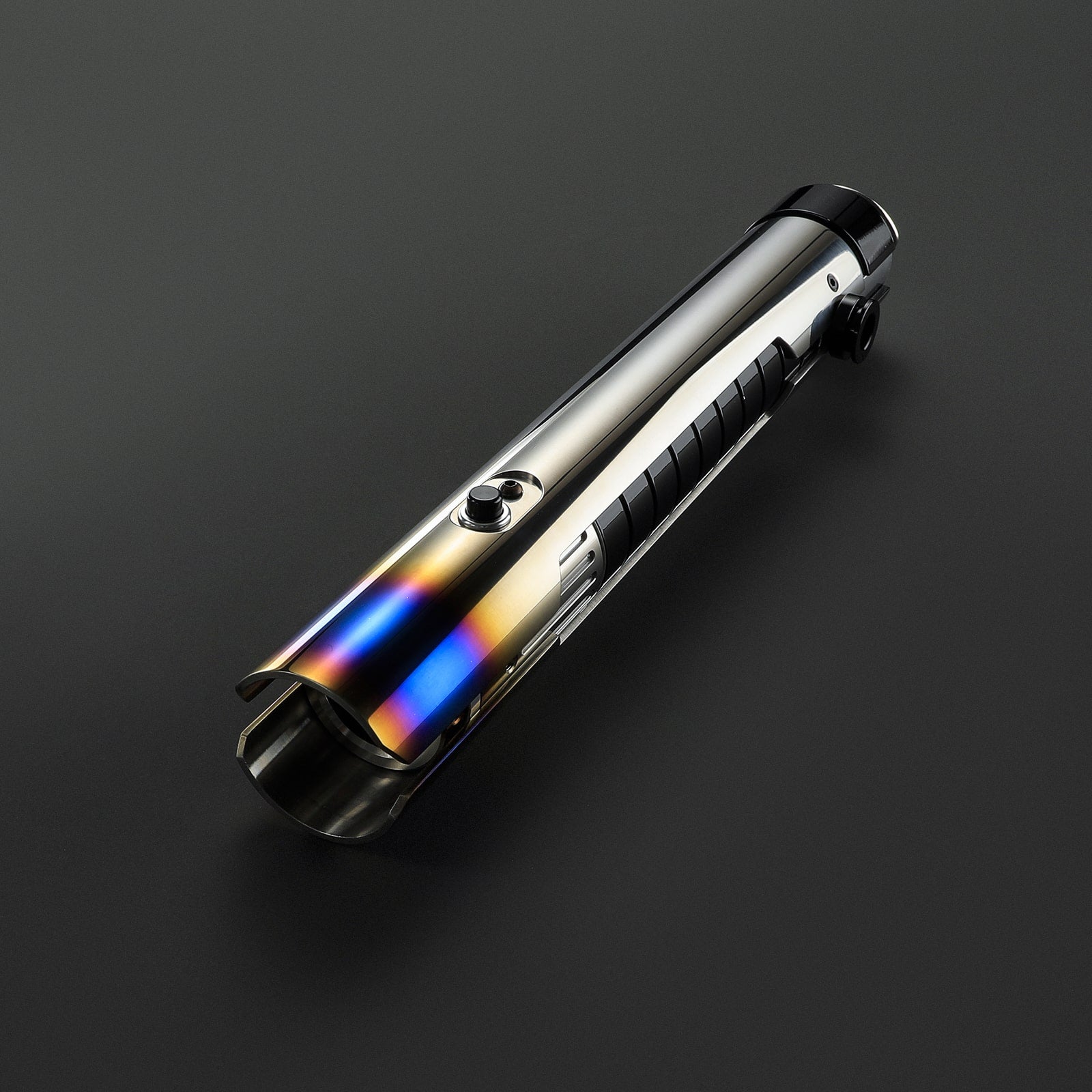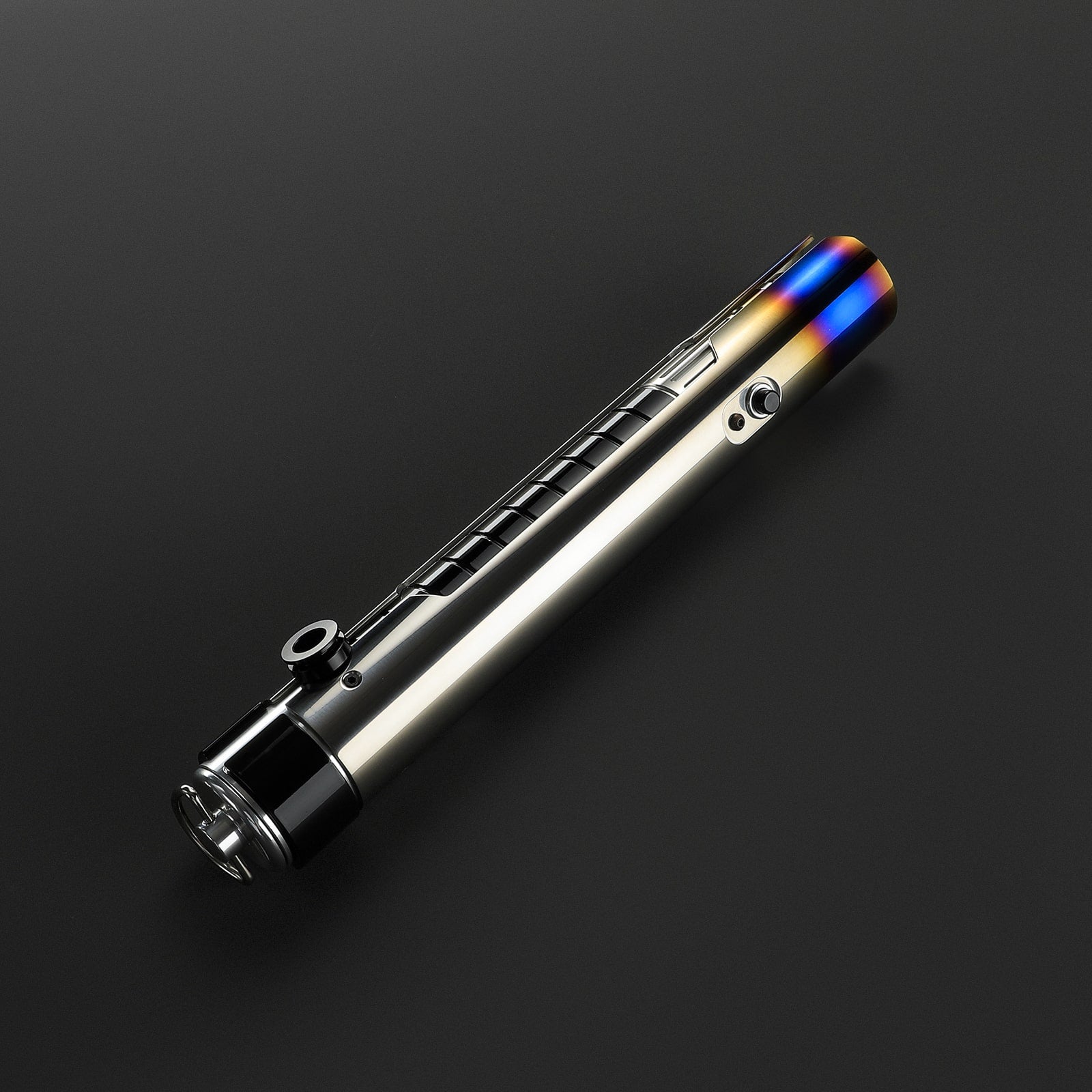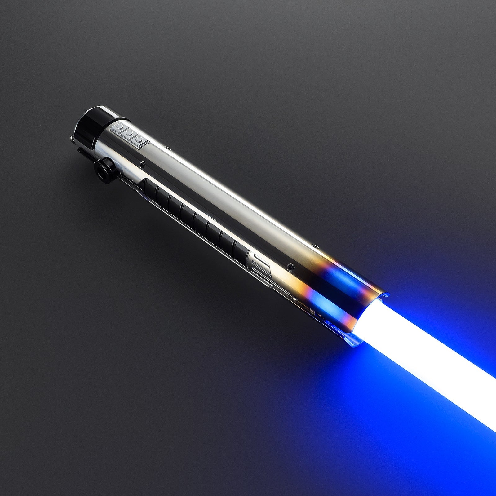 De Xsol lightsaber straalt kracht en elegantie uit. De hilt is voorzien van een stevige 'sleeve' beplating die zich van onder naar boven over de gehele lengte van de hilt uitstrekt, aan beide zijden. Dit ontwerp laat in het midden de kern van de zwarte hilt met horizontale uitfrezingen zien, wat de saber een robuuste en gedetailleerde uitstraling geeft. De emitterplaten steken uit en omringen het zwaardblad, met opvallende blauwe accenten aan de bovenkant die zorgen voor een indrukwekkend heet/warm effect. De subtiele, zwarte bedieningsknop is naadloos geïntegreerd in het design, wat bijdraagt aan de strakke en gestroomlijnde uitstraling. Aan de pommel bevindt zich een D-clip voor eenvoudige bevestiging aan je riem met behulp van de riemclip., het covertech wheel aan de zijkant biedt extra bevestigingsopties. Dit maakt de Xsol niet alleen visueel aantrekkelijk, maar ook praktisch en veelzijdig. Bovendien is het een van de meest betaalbare Legendary sabers op dit moment, ideaal voor zowel verzamelaars als actieve gebruikers.