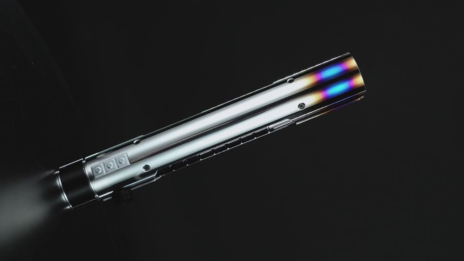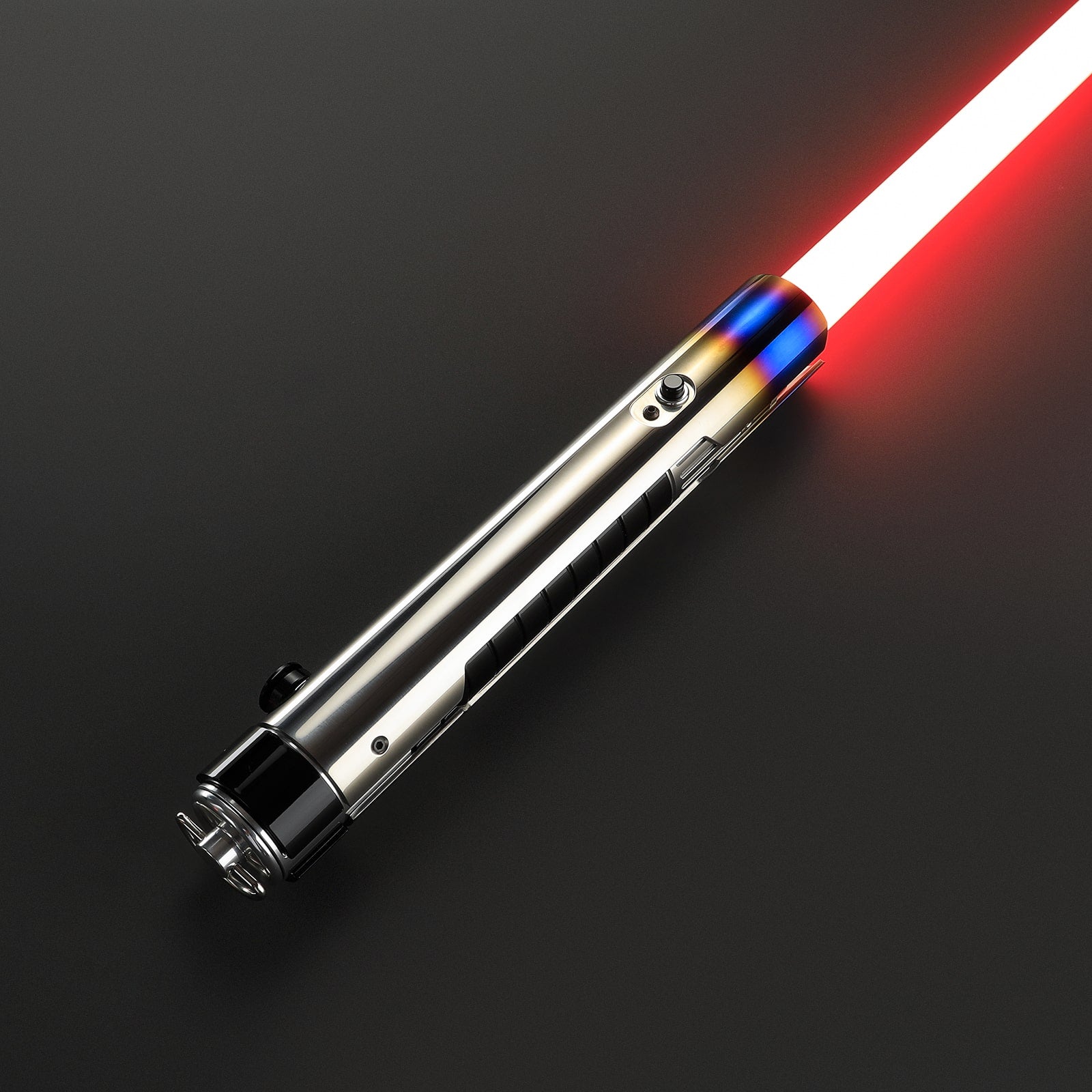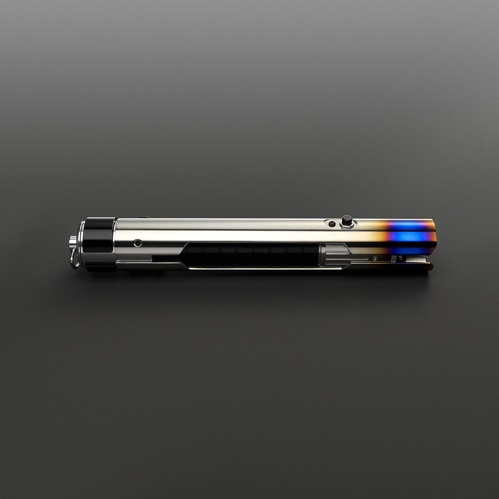 De Xsol lightsaber straalt kracht en elegantie uit. De hilt is voorzien van een stevige 'sleeve' beplating die zich van onder naar boven over de gehele lengte van de hilt uitstrekt, aan beide zijden. Dit ontwerp laat in het midden de kern van de zwarte hilt met horizontale uitfrezingen zien, wat de saber een robuuste en gedetailleerde uitstraling geeft. De emitterplaten steken uit en omringen het zwaardblad, met opvallende blauwe accenten aan de bovenkant die zorgen voor een indrukwekkend heet/warm effect. De subtiele, zwarte bedieningsknop is naadloos geïntegreerd in het design, wat bijdraagt aan de strakke en gestroomlijnde uitstraling. Aan de pommel bevindt zich een D-clip voor eenvoudige bevestiging aan je riem met behulp van de riemclip., het covertech wheel aan de zijkant biedt extra bevestigingsopties. Dit maakt de Xsol niet alleen visueel aantrekkelijk, maar ook praktisch en veelzijdig. Bovendien is het een van de meest betaalbare Legendary sabers op dit moment, ideaal voor zowel verzamelaars als actieve gebruikers.